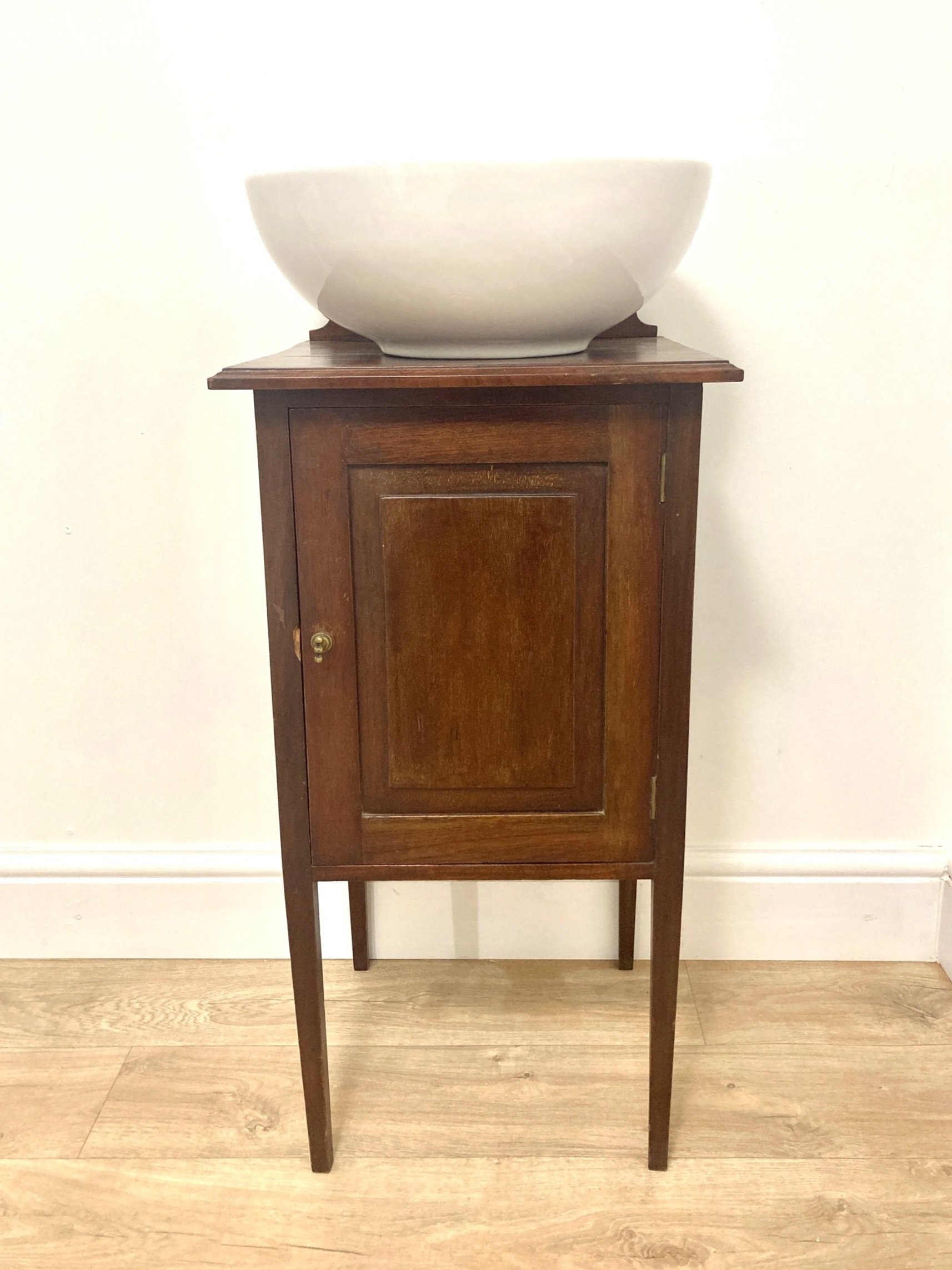 Solid mahogany pot cupboard with tapered legs and one door with cute original twist knob. Also has an attached upstand which could be removed and added back on top of marble/stone top, if desired. This piece is very petite and would suit a 35cm basin (basin shown in photos is 40cm. Ideal for a cloakroom or small bathroom.